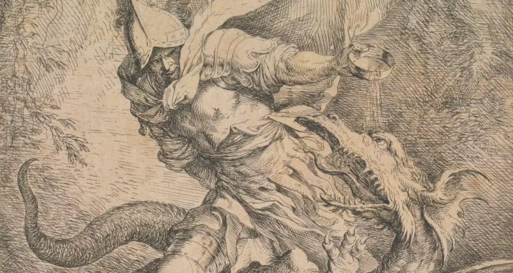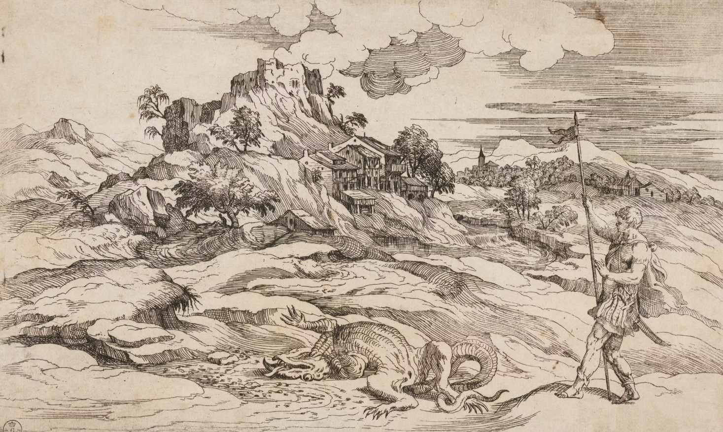 The three engravings were made by Cornelis Cort based on a drawing by Giulio Clovio, author of Saint George and the Dragon (1577), Salvator Rosa with Jason Putting the Dragon to Sleep (1663-1664) and finally Giovanni Battista D’Angolo known as del Moro, after Titian, with the Landscape with Saint Theodore and the Dragon, 1560-70.