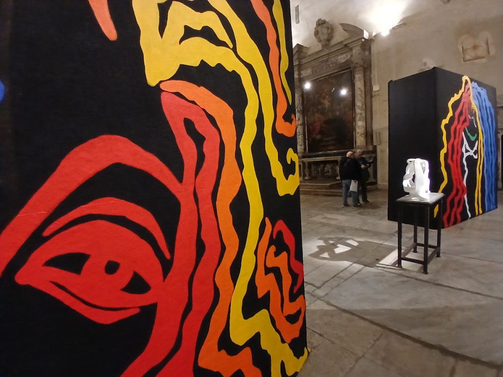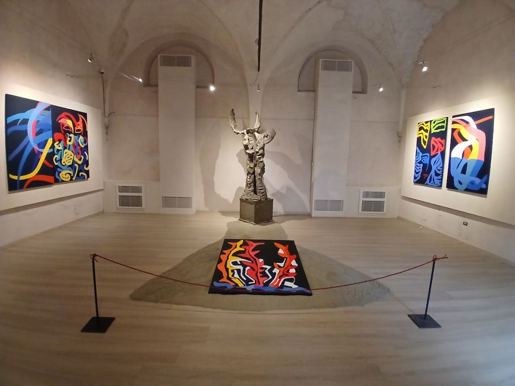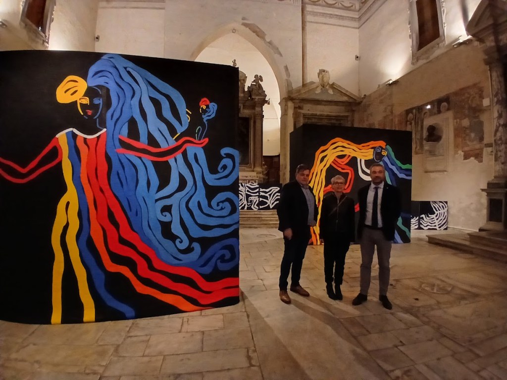 Moving among the large canvases exhibited in the deconsecrated church is like entering the mind of Pisani who, with her joyful creativity, manages to involve and transport anyone into her artistic poetics.