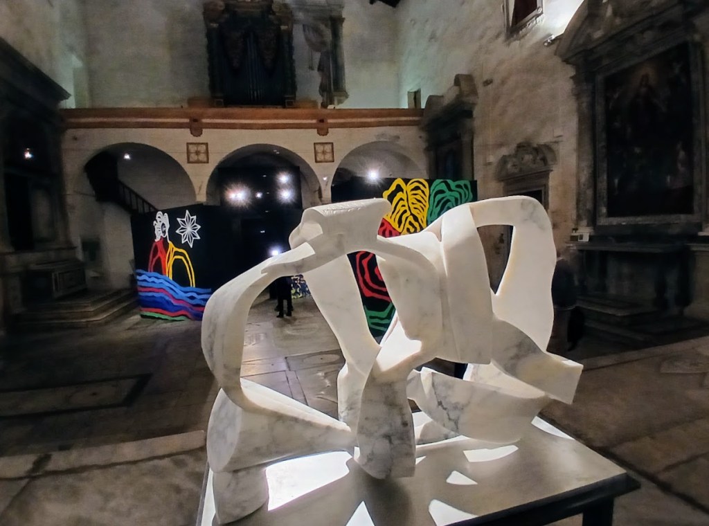 I grandi teleri esposti in Sant’Agostino creano un percorso con al centro l’opera Archeosegno, una delle più note dell’artista esposta anche alla Biennale di Venezia, realizzata in un solo blocco di marmo del Monte Altissimo.