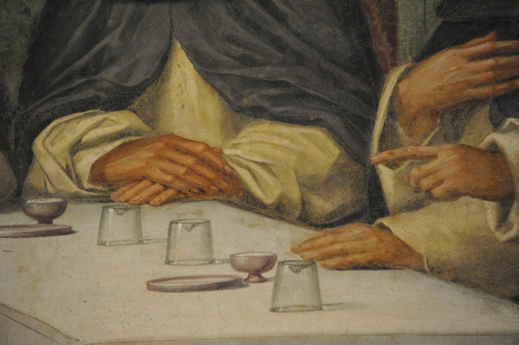 A sorprendere di più in quest’opera è la minuziosa cura di alcuni dettagli come le trasparenze del vetro dei bicchieri, i drappi tenuti fra le mani dagli angeli che contengono il pane e la resa delle ali degli angeli.