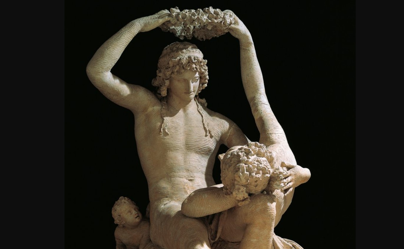The goddess, desperate for the loss of her beloved, asked Zeus to bring Adonis back to life, but only for a part of the year. Thus, every spring Adonis rose from the earth, bringing with him the rebirth of nature, and Venus could embrace him again. The crown of flowers that Venus is about to place on Adonis’ head symbolizes the spring that sees them united once again.