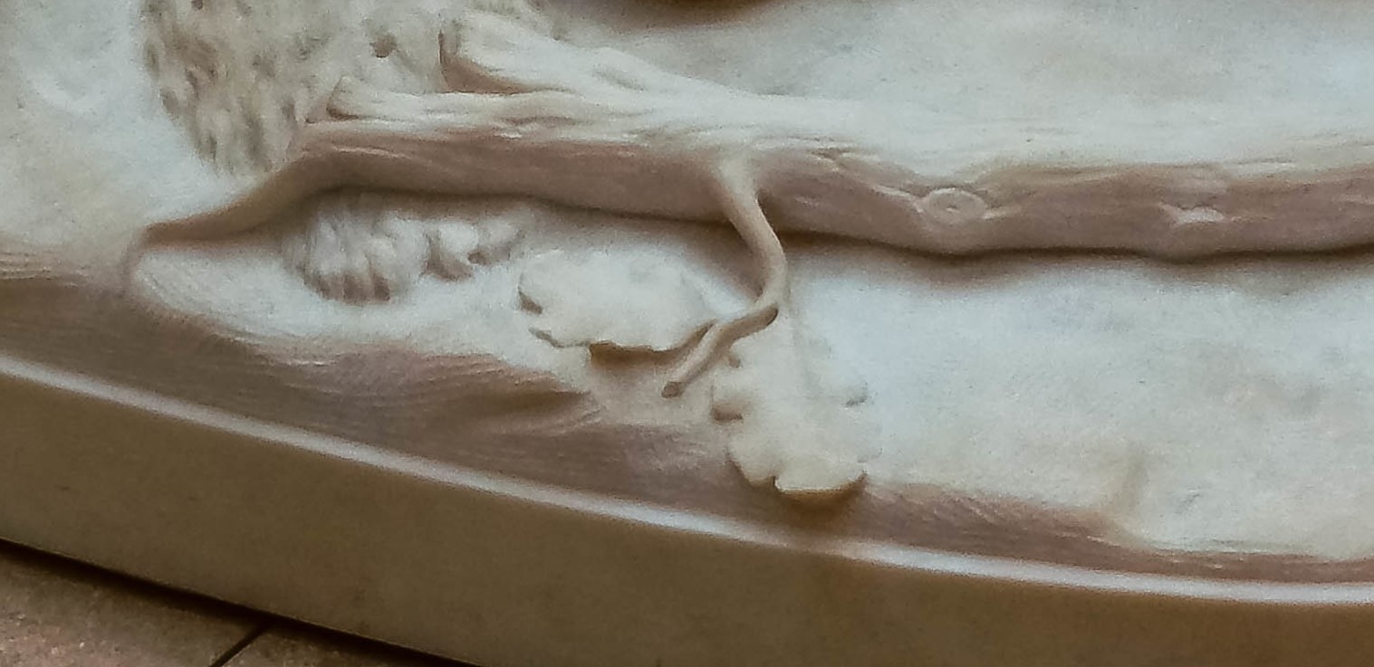 The sculptor depicted Abel naked, with his pubic area covered by a fur. Lying on the ground, he is now lifeless and on his forehead, in front of the spectator, you can see the wound inflicted by his brother Cain.