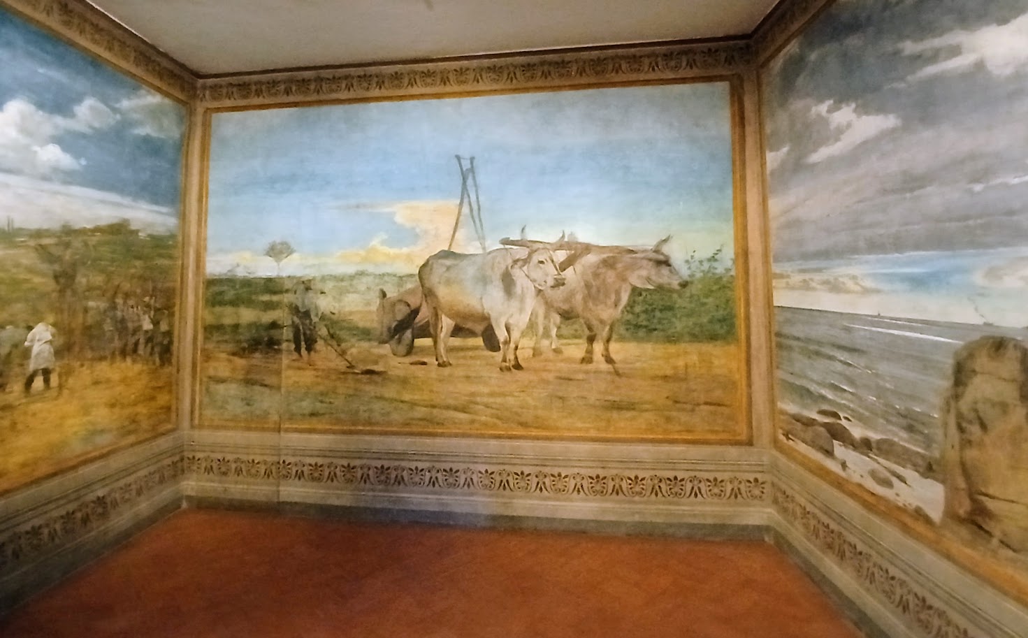 The landscape that can be seen is typical of the Castiglioncello countryside with olive groves, haystacks and landscapes with yoked oxen at the center of the scene.