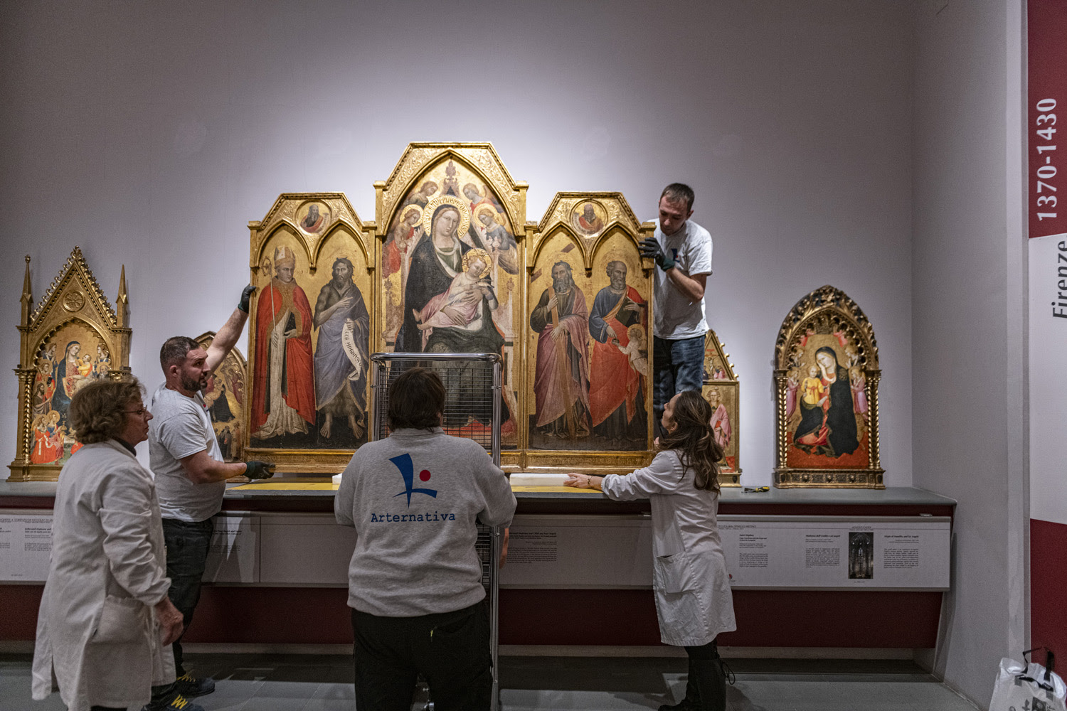 In the meantime, the work has left the Galleria dell’Accademia in Florence and during the period of its absence, it will be replaced in the exhibition by the Madonna and Child enthroned between the saints John the Baptist and Zanobi by Niccolò di Pietro Gerini, created between 1395 and 1400, a work usually kept in storage.