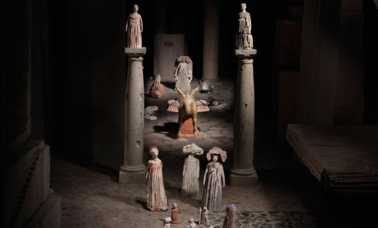 E’ una composizione di più figure che richiamano le processioni religiose in Sicilia, a cominciare dal somarello dorato che invece di portare fascine, ha con se due modellini di un tempio greco.