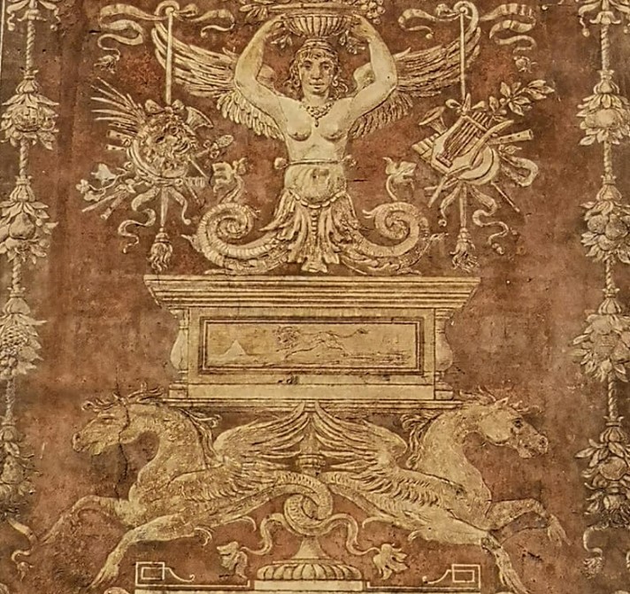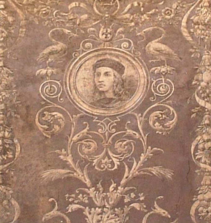 In the facade decorated with the sgraffito technique, I, Raphael and Titian are represented. Following a bit of the style of the grotesques, to the effigies of us three Renaissance artists, dragons, chimeras, winged horses but also garlands, fruit bowls, anthropomorphic figures and the inevitable acanthus leaves have been added.
