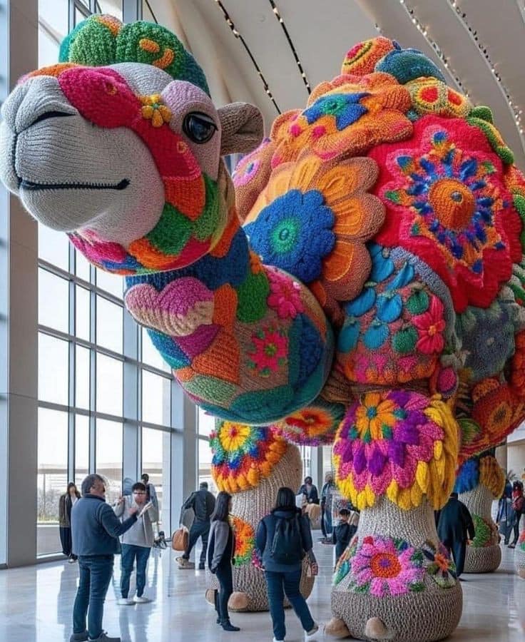 At first glance they seem like large animal puppets made with skill and patience in crochet, with very colorful wool threads. The photos circulating online also have a plausible setting which is that of a museum, apparently created specifically to host these colorful giants.