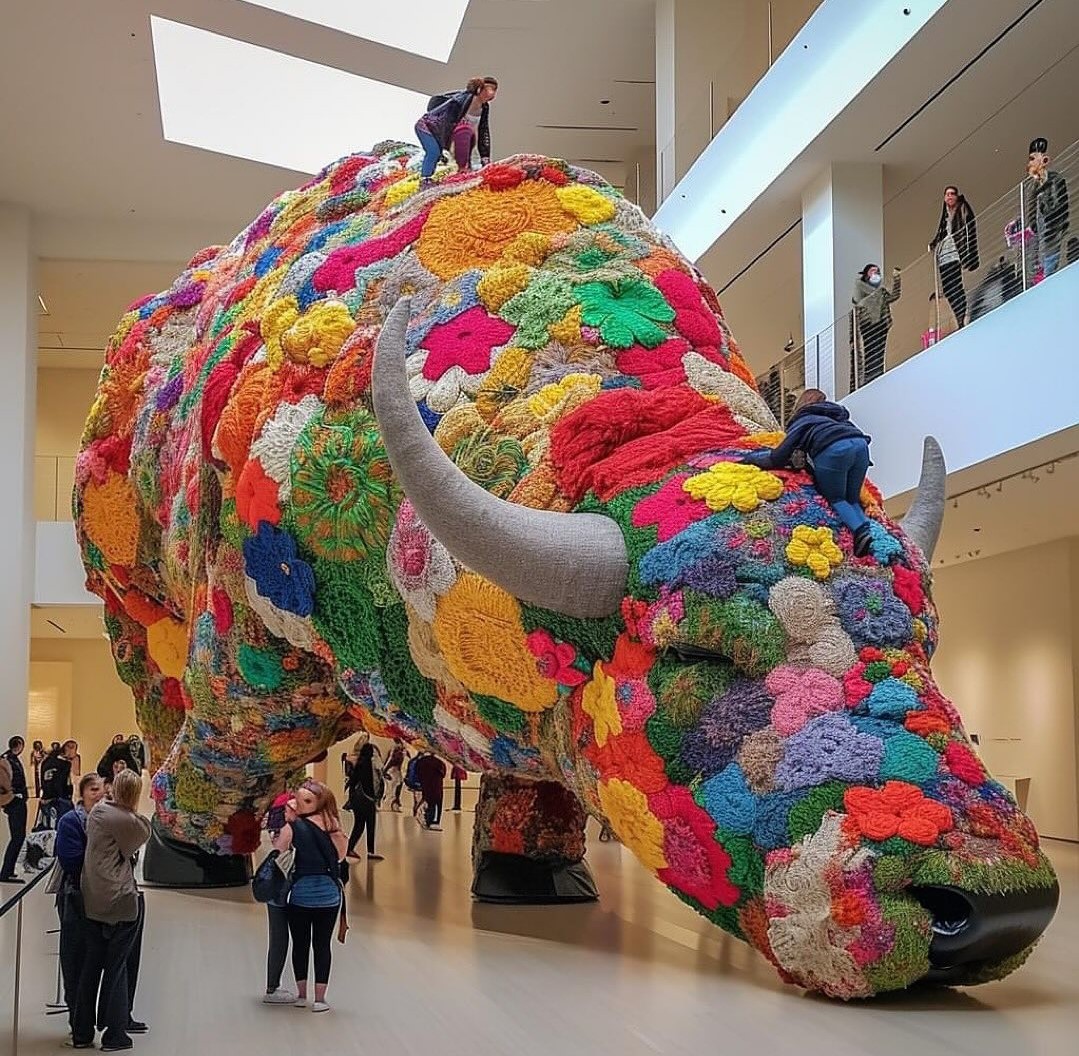 A prima vista sembrano grandi pupazzi di animali realizzati con abilità e pazienza all’uncinetto, con fili di lana coloratissimi. Le foto che circolano in rete hanno anche un’ambientazione verosimile che è quella di un museo, a quanto pare creato apposta per ospitare questi giganti variopinti.
