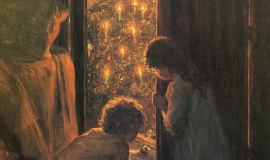 L’opera appartiene a una collezione privata e mostra due fratellini che la mattina del 25 dicembre si svegliano, scendono dal letto e da dietro la porta socchiusa guardano l’albero di Natale o meglio, cercano di capire se Babbo Natale ha lasciato loro qualche regalo.