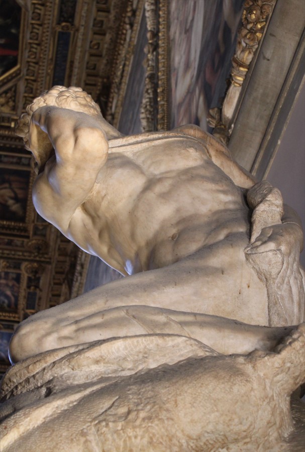 In the immensity of the Salone de’ Cinquecento, the Genius of Victory almost disappears and yet, observing it from a close distance, it shows a power that the other sculptures present there do not have.