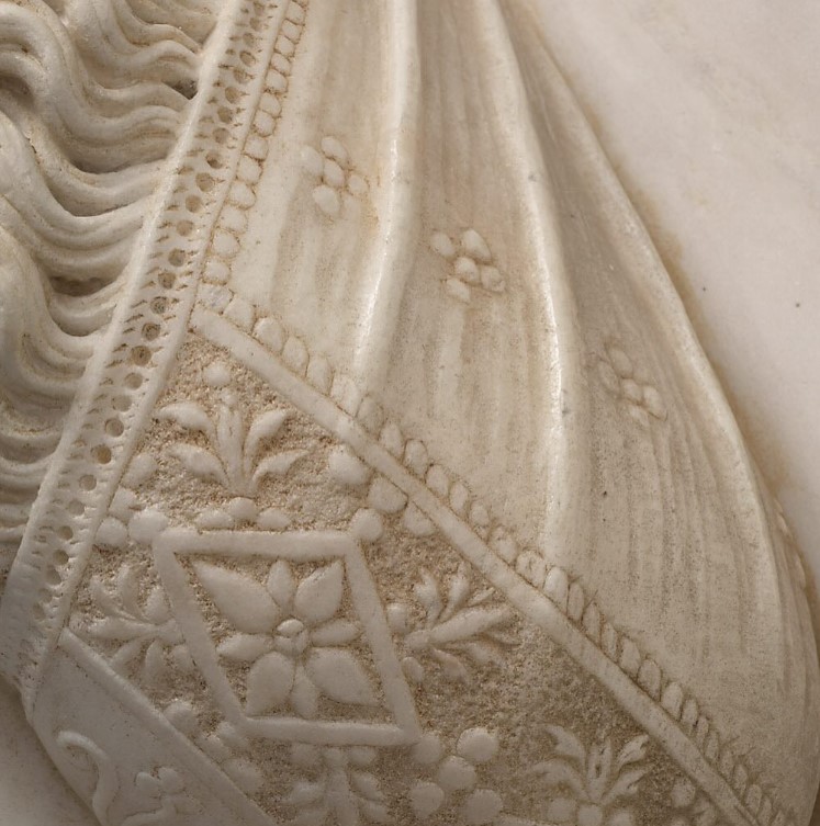 Osservate con attenzione con quanta cura siano stati lavorati i capelli di lui e la cuffia di lei, con ancora visibili i buchi fatti con il trapano e i sottili ricami.
