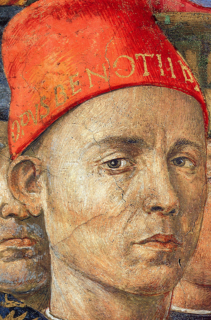 Anche Benozzo Gozzoli non volle rinunciare a entrare nell’affresco ritraendosi con tanto di berretto con il nome scritto in lettere d’oro.