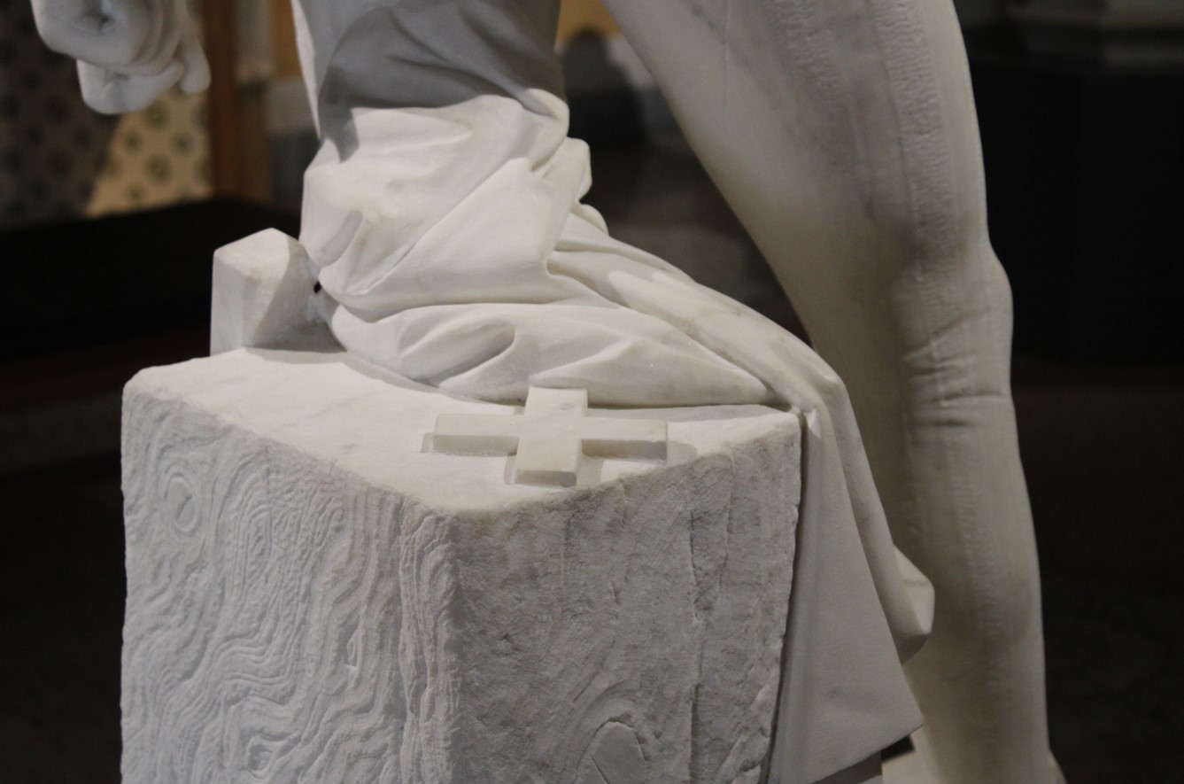Corradino was the last ruler of the Swabians, who became king as a teenager. Corti captured a dramatic moment in the marble, that which preceded his execution, ordered by the king of Sicily Charles of Anjou.