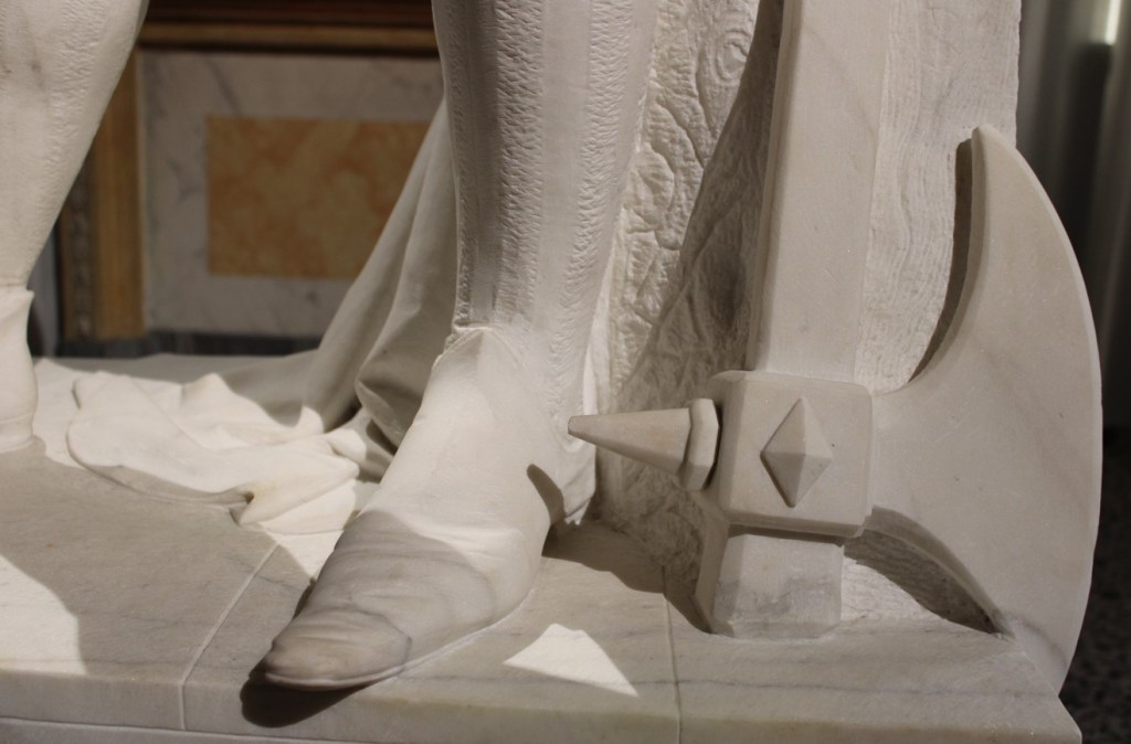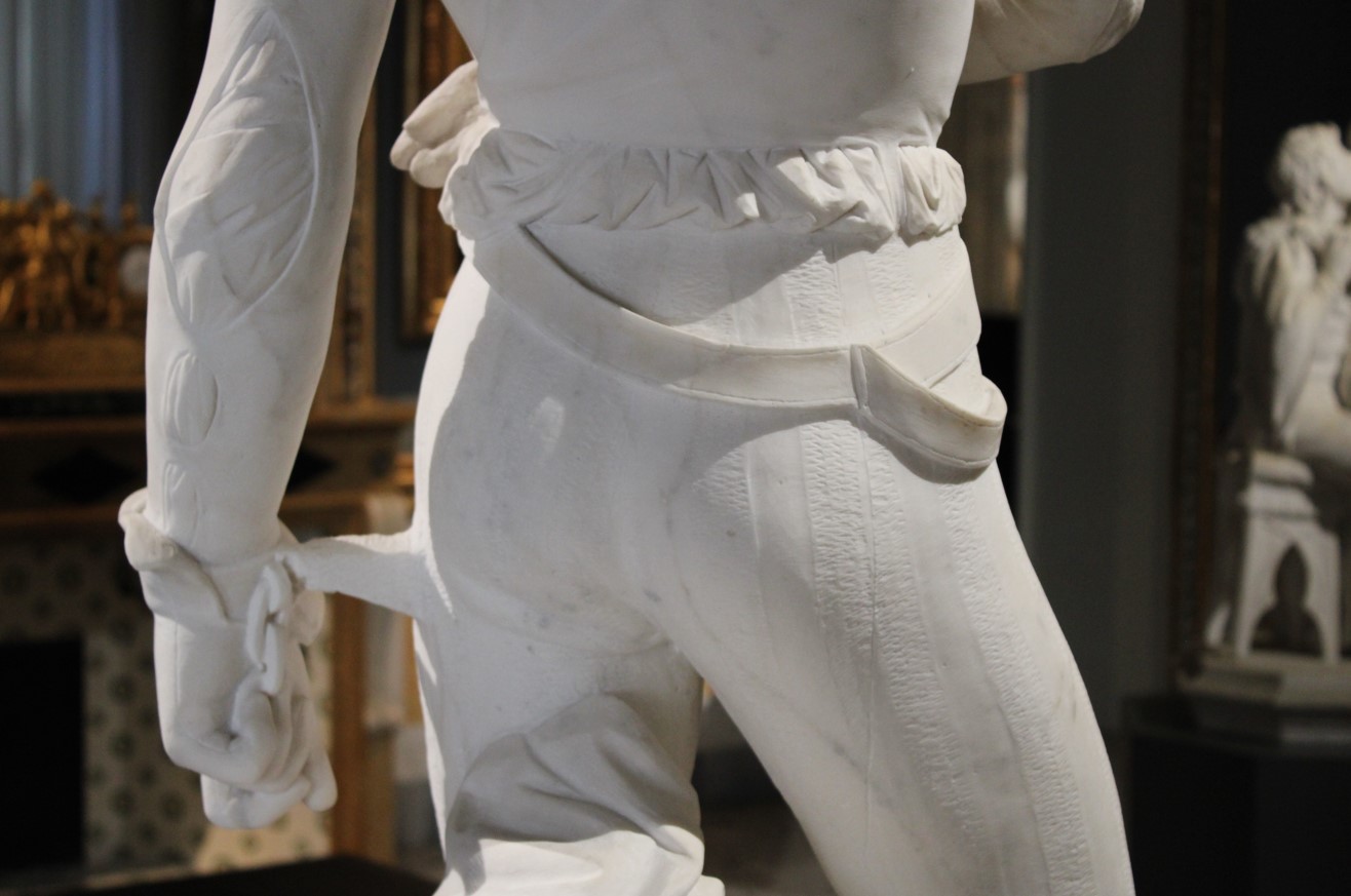 Looking at the sculpture from close up, you can see the refined workmanship of the marble. The puffs of the shirt that come out of the bodice as well as the extraordinary texture of the tights, are real pieces of bravura by Corti.