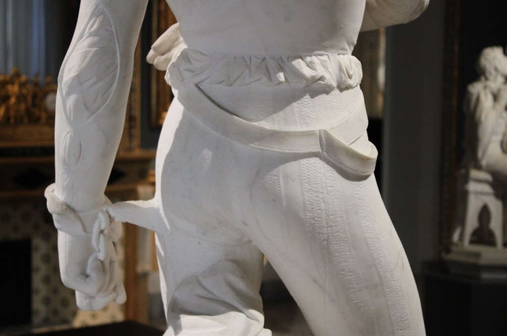 Osservando a distanza ravvicinata la scultura, si nota la raffinata lavorazione del marmo. Gli sbuffi della camicia che fuoriescono dal corpetto così come la straordinaria trama della calzamaglia, sono dei veri e propri pezzi di bravura di Corti.