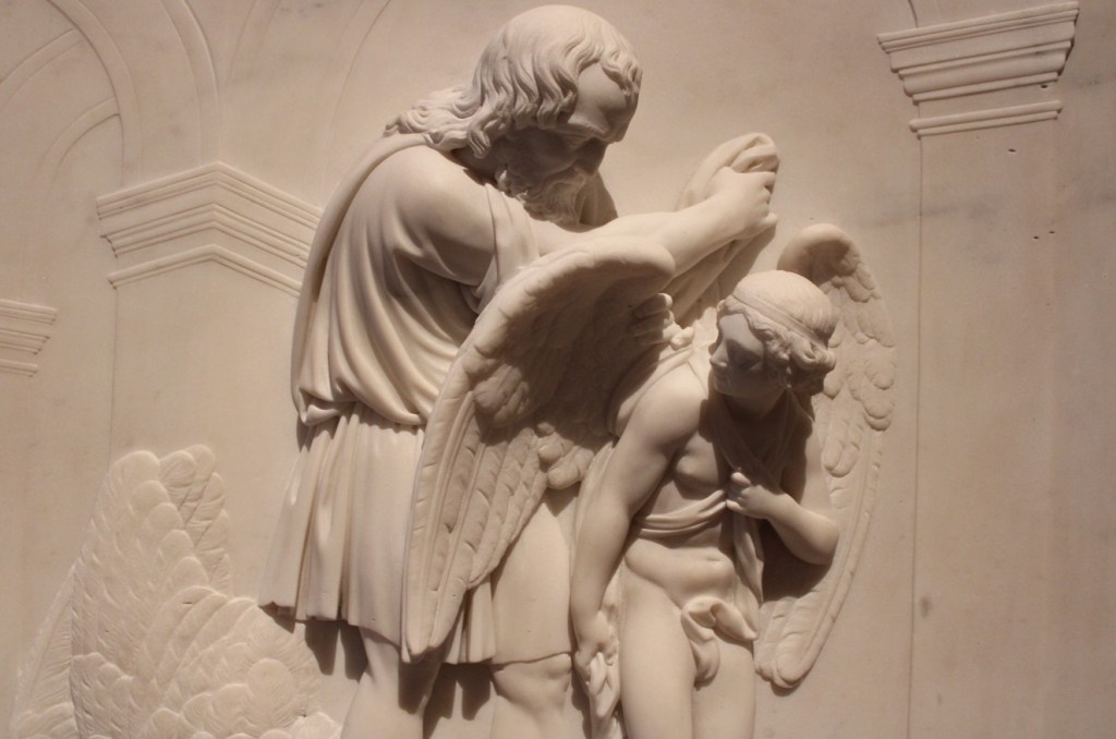 Franchi’s bas-relief is very detailed. Observe how carefully the artist sculpted the sandals that Daedalus wears and the feather wings that Icarus is already wearing.