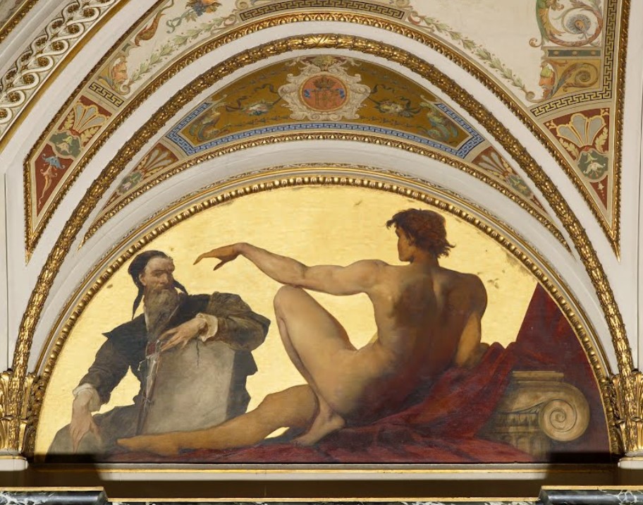 The artist Hans Makart, born in Salzburg on May 28, 1840, was commissioned to paint the fresco to decorate the ceiling, lunettes, pendentives and areas between the columns of the main staircase of the new museum.