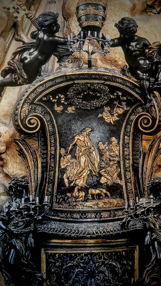 It was designed as a reliquary, to house the ancient seat that legend had it belonged to St. Peter. Subsequent studies have amply demonstrated that it is actually an ancient seat from the Carolingian era, 9th century, which has little to do with the apostle. Just think, the seat has pagan origins, so much so that it was decorated with ivory plaques representing the Labors of Hercules.