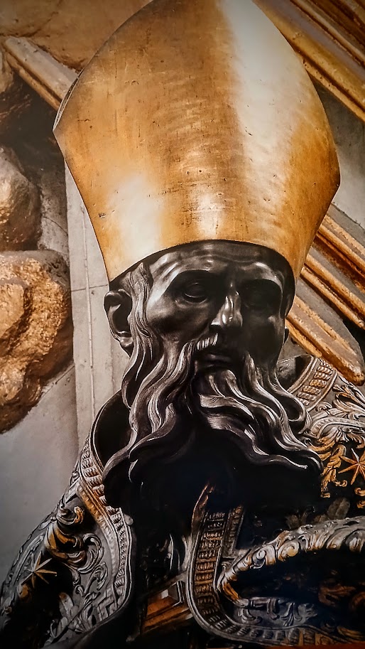 Un po’ le loro dimensioni si perdono nella vastità della basilica ma in realtà sono tutte e quattro alte più di 5 metri. Le sculture davanti rappresentano Sant’Agostino e Sant’Ambrogio, padri fondatori della chiesa occidentale, mentre alle loro spalle ci sono i padri di quella orientale: Sant’Anastasio e San Giovanni Cristomo.
