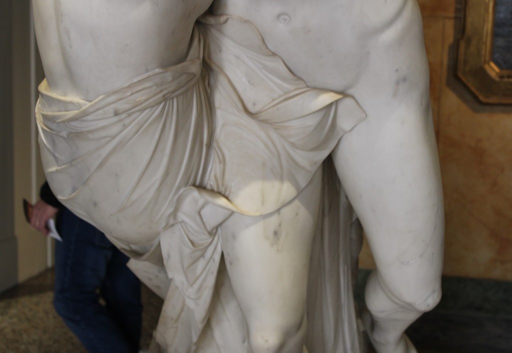 A colpire in modo particolare di quest’opera non è tanto il modellato classicista ma piuttosto l’impronta teatrale delle due figure che fa pensare a una vera e propria messa in scena delle loro vite. Lo scorcio prospettico che si ha guardando la scultura dalla parte anteriore non è sufficiente per apprezzarne appieno il dinamismo.