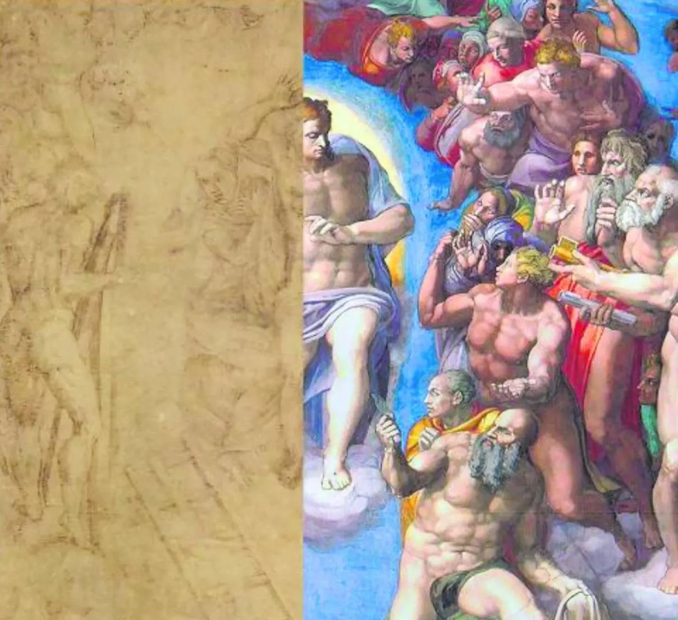 Al momento ne è stata resa nota solo una porzione ed è quella che vedete nella foto, affiancata alla porzione del Giudizio Universale con la quale combacerebbe. Il che mi fa pensare solo così piuttosto a una copia dall’opera mia che a uno studio preparatorio. Attendo però di vedere l’intero prima di dare un giudizio in merito.