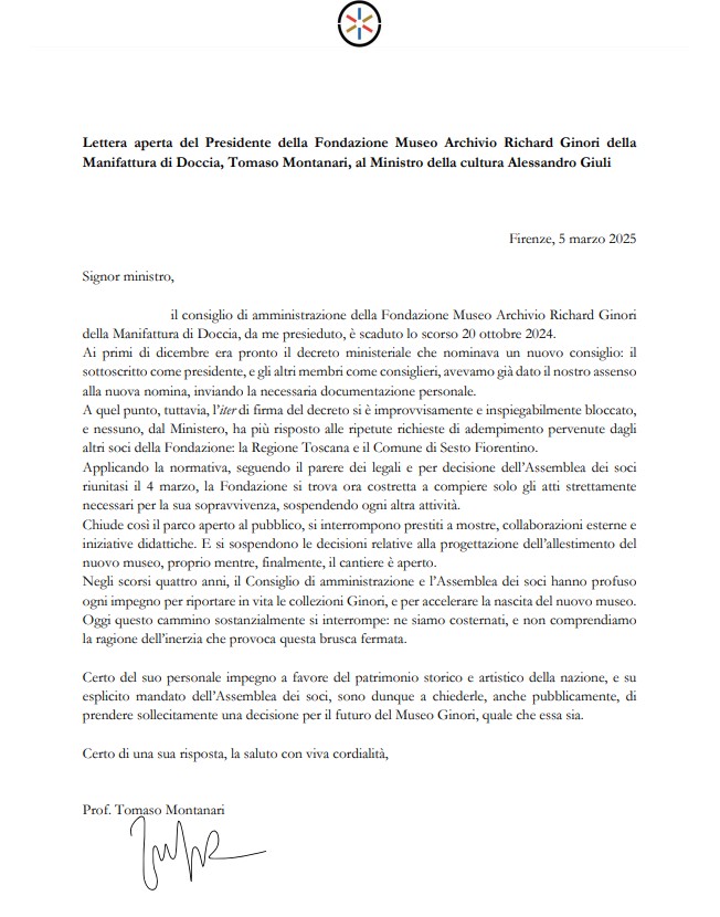 Qualche giorno fa, il 5 marzo 2024, Tomaso Montanari, presidente della Fondazione Museo Archivio Richard Ginori, ha scritto una lettera aperta ad Alessandro Giuli, ministro della cultura ricordando che il consiglio di amministrazione da lui presieduto della fondazione è scaduto il 20 ottobre 2024, cinque mesi fa.