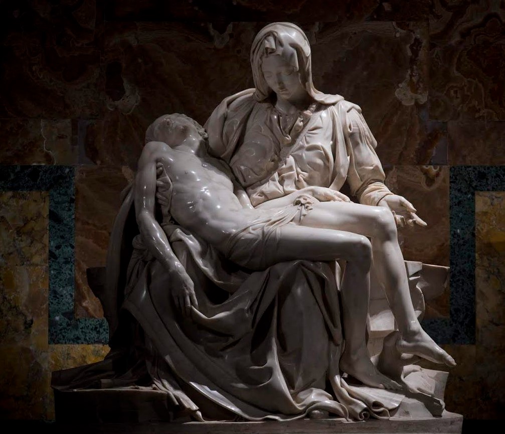 The Vatican Pietà and the Body of Christ shown by the Mother with her left hand
