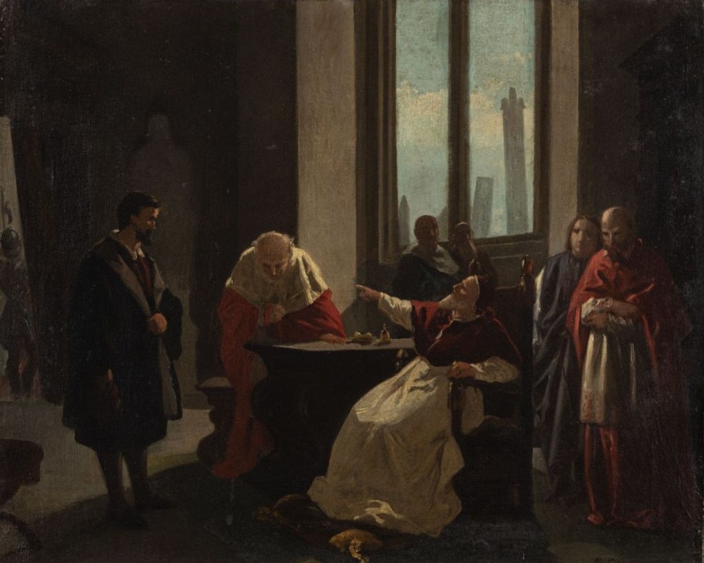 On the occasion of the 550th anniversary of my birth, today I want to propose to you the oil painting on canvas depicting me in the presence of Pope Julius II in Bologna, made by Enrico Fanfani in 1875.