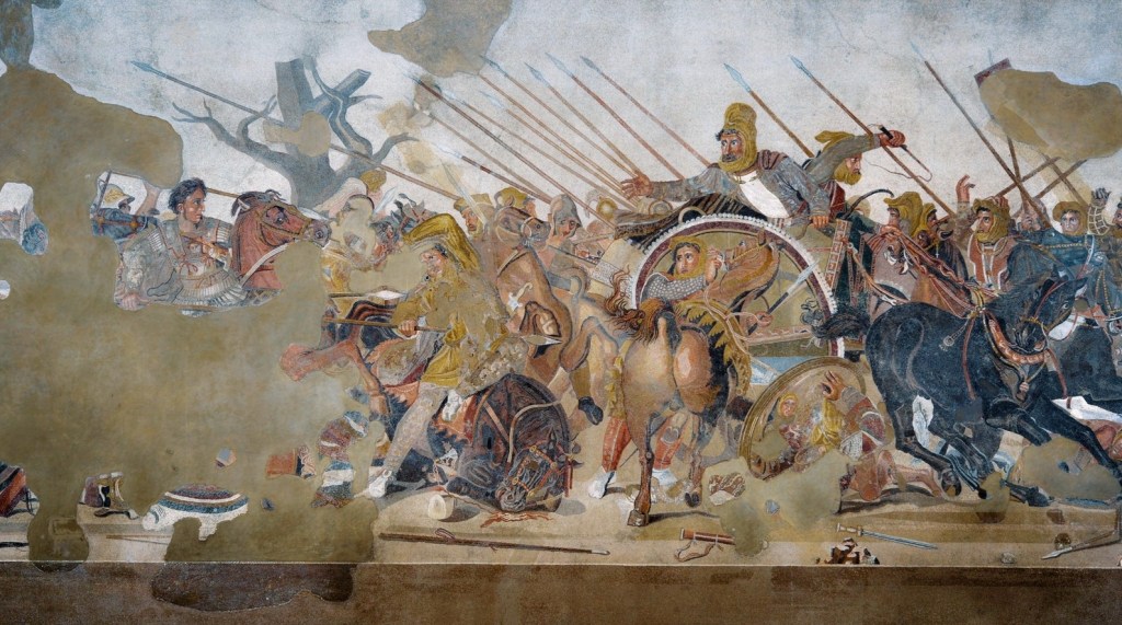 Quest’opera straordinaria, rinvenuta a Pompei, raffigura il trionfo di Alessandro Magno su Dario III di Persia e rappresenta una delle fonti più rilevanti per ricostruire le sembianze reali del leggendario condottiero macedone.