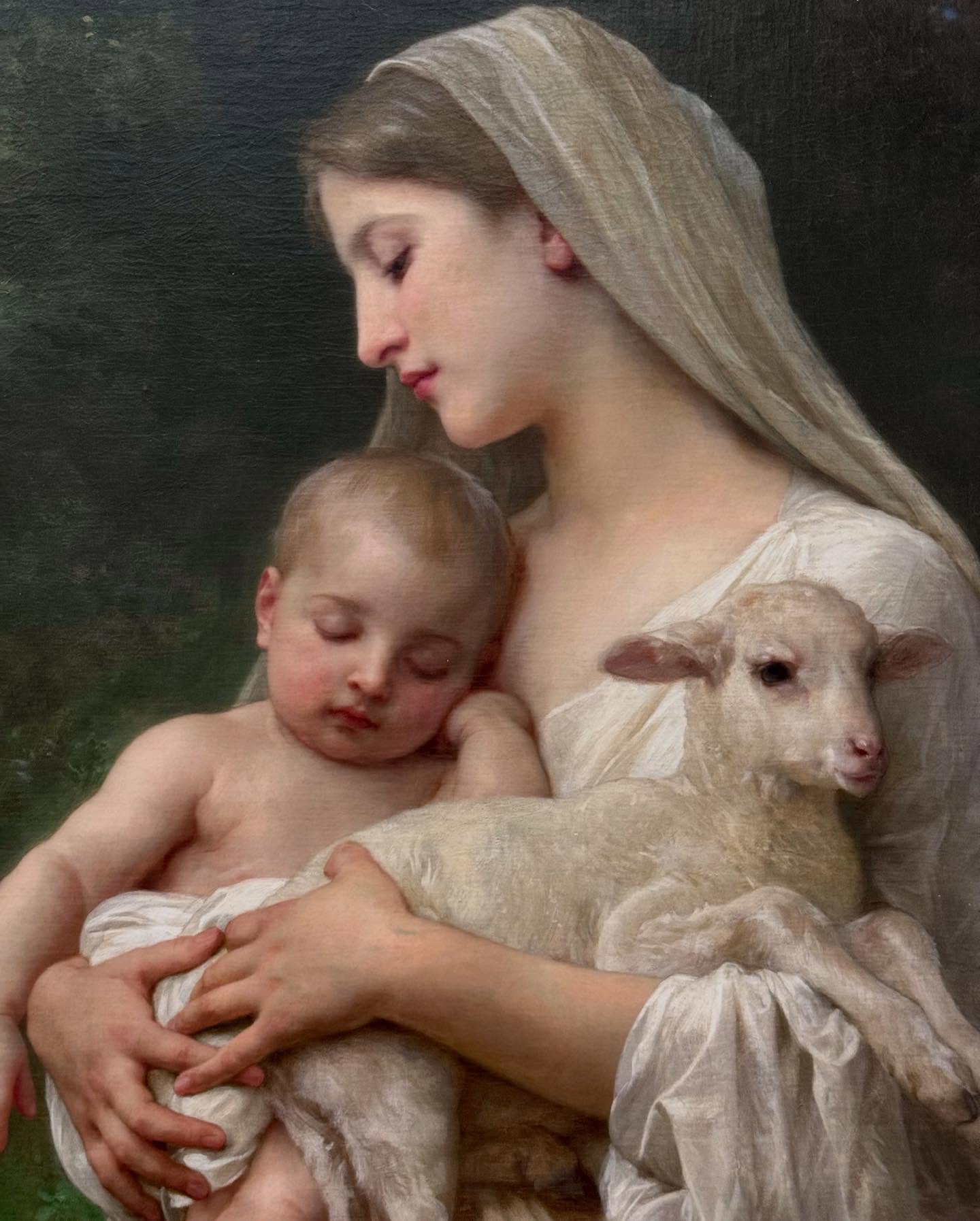 The work depicts innocence in a very symbolic way through the image of the young mother holding her baby and a lamb in her arms.