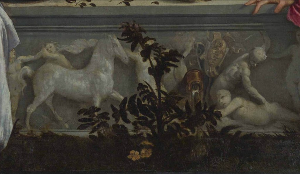 The duality between sacred and profane love is also reflected in the background: on the left a mountain view is clearly visible while on the right a lake landscape can be seen.