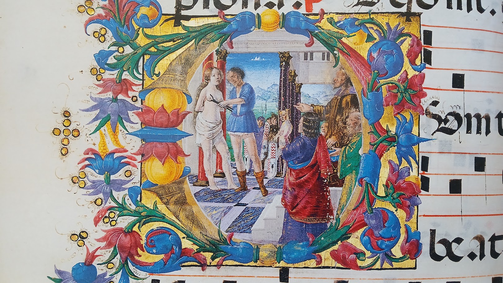 It is true that the miniatures made by Bartolomeo della Gatta mentioned by Vasari have never been traced but it is equally true that there are other admirable ones by his hand such as for example the Proprium Sanctorum Antiphonary of the Cathedral of Urbino which houses the exceptional miniature of the Martyrdom of Saint Agatha.