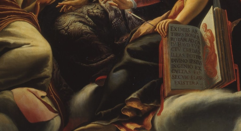 On the occasion of the 550th anniversary of my birth, I want to talk to you about the painting ‘The Four Arts crown Michelangelo’, created by Sigismondo Coccapani.
