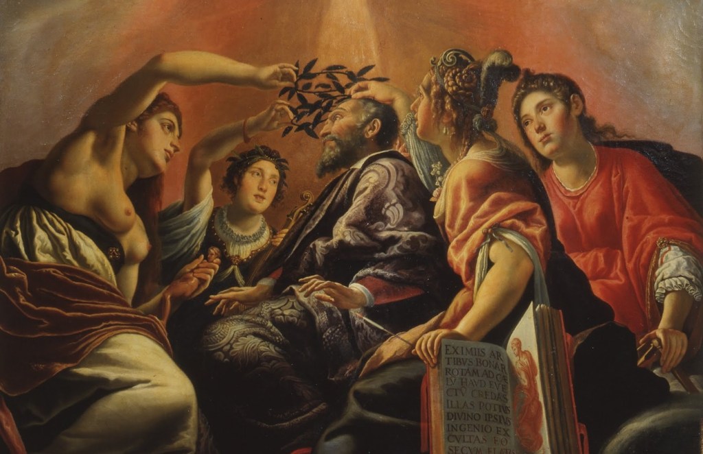 The personification of Painting, Architecture, Sculpture and Poetry crown me. The bare-breasted Sculpture holds a small sculpture in one hand while Poetry holds a capotasto.