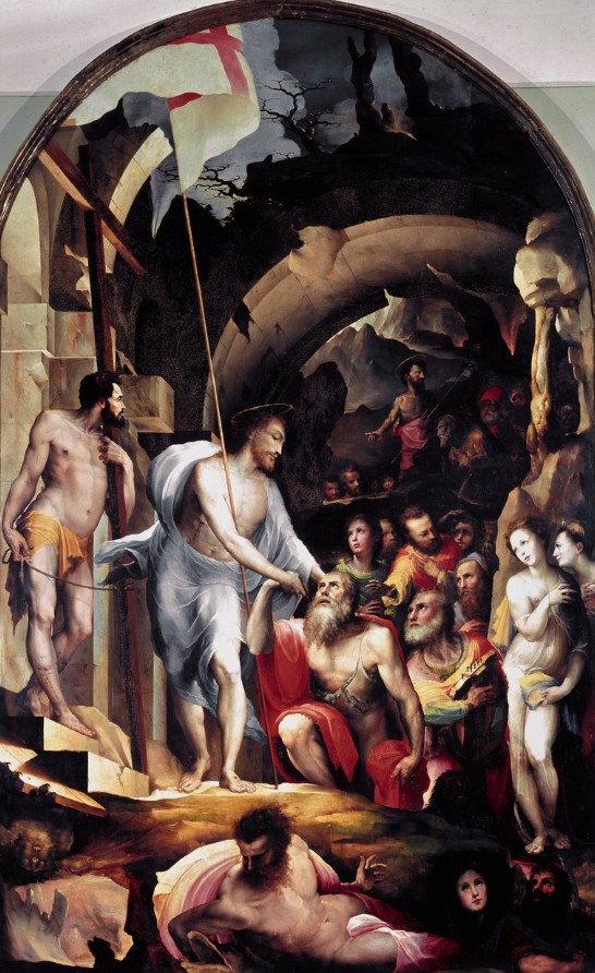 Il Beccafumi lo dipinse mentre sta aiutando i patriarchi dell’Antico Testamento Adamo, Abramo, Eva e Re Davide a uscire da quel luogo.