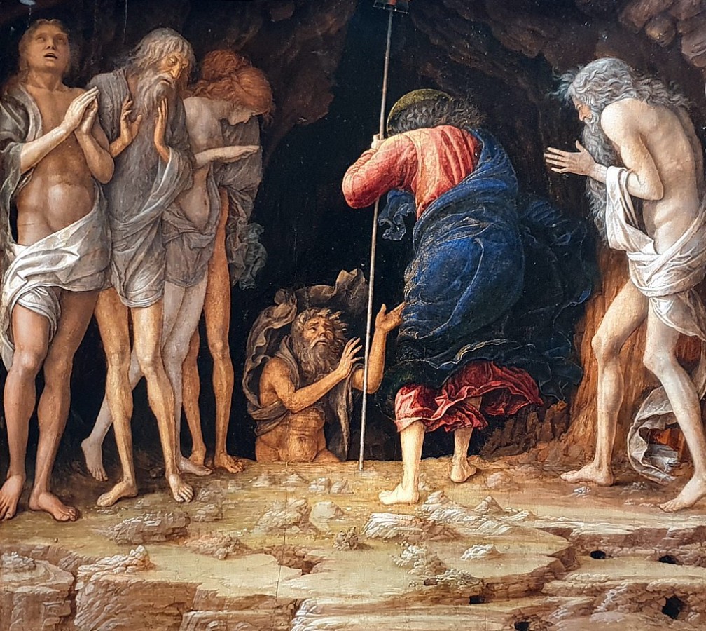Mantegna raffigurò il Cristo al centro della scena e in primo piano. E’ insolitamente girato di spalle e si sta rivolgendo ai cosiddetti savi del Limbo che poi Lui stesso porterà con sé in Paradiso.