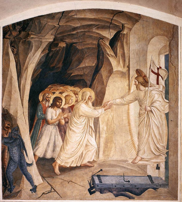Il Beato Angelico dipinse gli inferi come una caverna spaventosa perché lì le anime sono prive dell’amicizia di Dio. Cristo compare nella caverna e illumina il luogo. Stringe in mani il vessillo vittorioso della Croce mentre un demonio rimane schiacciato dal peso della porta.