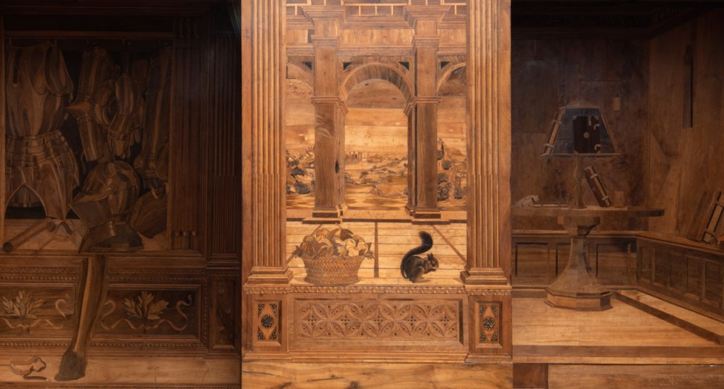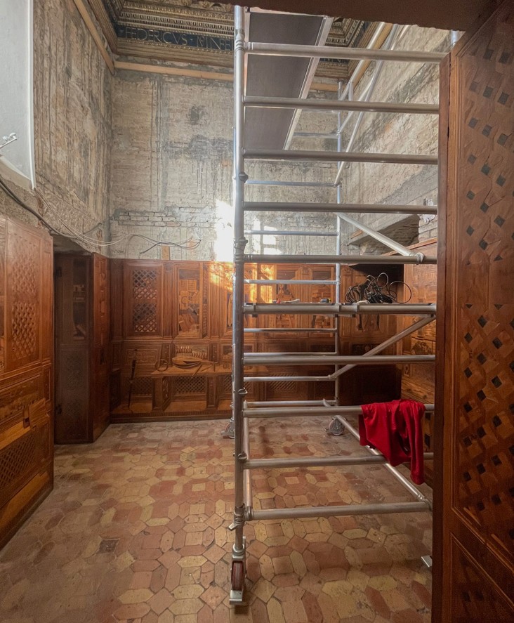 The Studiolo inlays and the coffered ceiling were dismantled in recent months and placed in the museum’s temporary storage to allow for work to update the electrical and fire prevention systems in this area of the building as well.