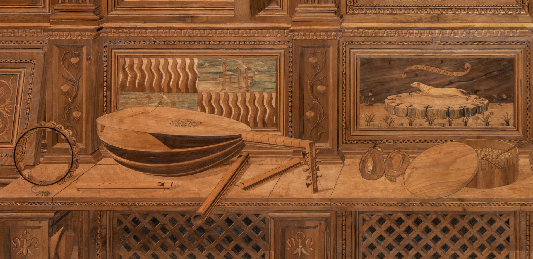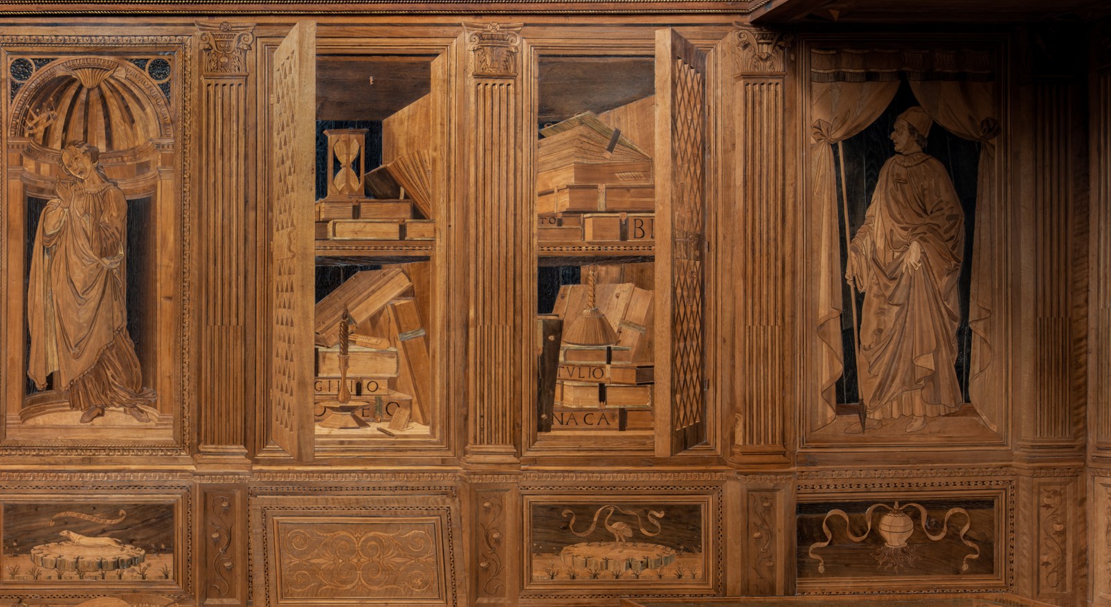 Lower down, the inlays depict shelves on which are scattered weapons, books and parchments, musical and mathematical instruments, even chess pieces, the theological Virtues (Hope, Faith and Charity) and Federico himself.