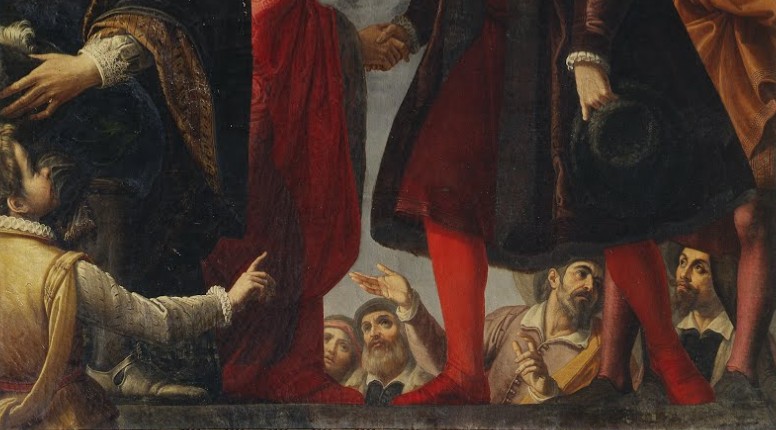 Osservate con quanta cura il Maruccelli dipinse i tessuti che foggiano i diversi personaggi che si muovono sulla scena. Quegli abiti damascati e quelle pellicce sontuose, i preziosi bottoni e i colletti della biancheria che si intravedono al di sotto delle vesti sono degli autentici pezzi di bravura.
