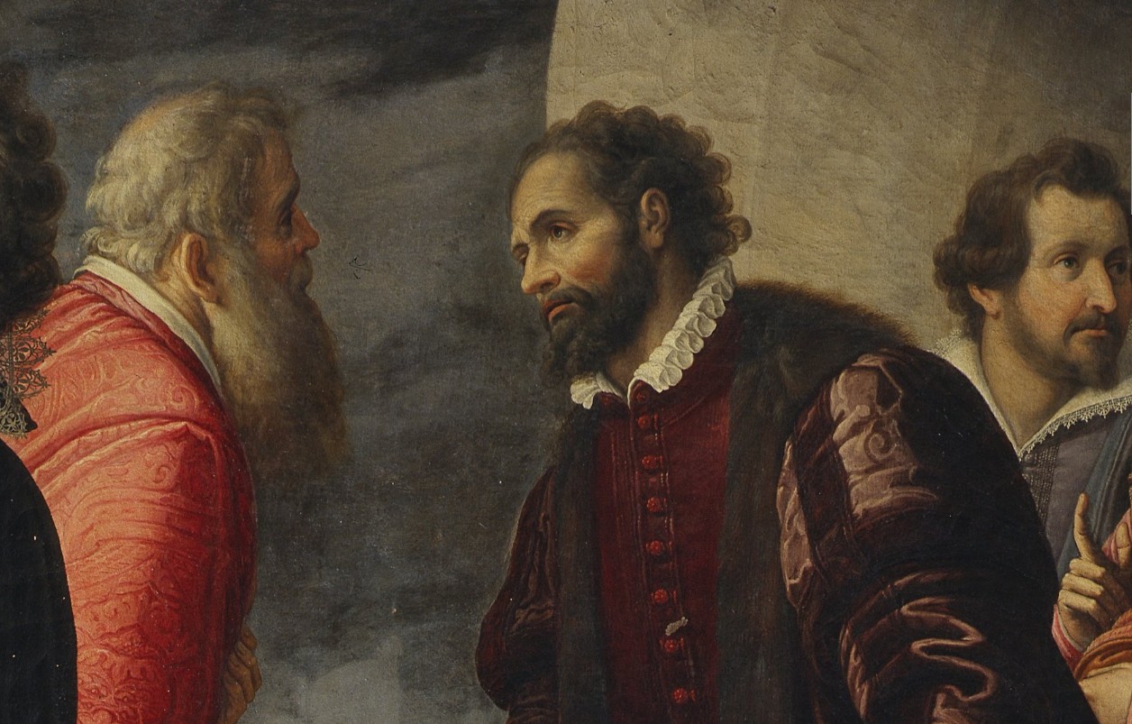 The title of the work is ‘Michelangelo in Venice is welcomed by the delegates of the Doge and the Senate’ and was created by Valerio Maruccelli between 1616 and 1618.
