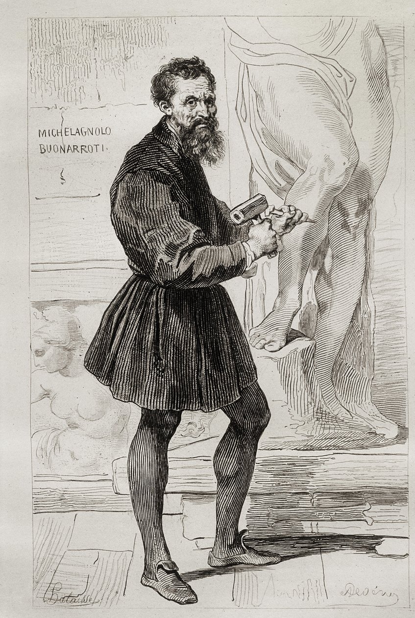 Ero mancino ma, nella raffigurazione, tengo lo scalpello con la mano sinistra e il mazzuolo con la destra. Nella vita di tutti i giorni ero invece solito impugnare gradine e subbie con la mano destra e il mazzuolo con la sinistra.