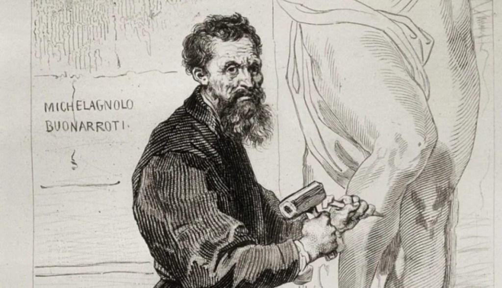 In occasione dei 550 anni dalla mia nascita, voglio proporvi un’acquaforte della prima metà dell’Ottocento di scuola francese in cui sono al lavoro sulle gambe dello Schiavo Ribelle di scuola francese.