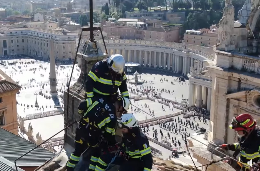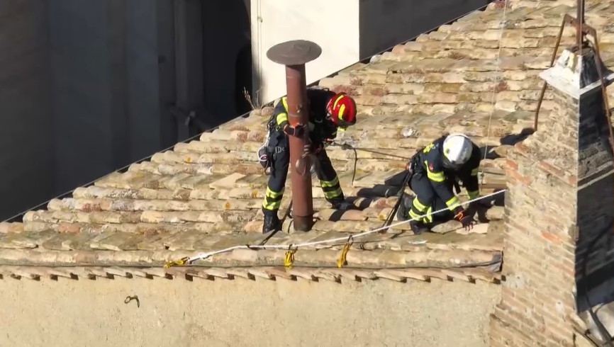 The two stoves connected to each other, the flue and the chimney from which the black smoke and the single white smoke will come out, the one that signals the election of the new pontiff, have now been positioned in their places.