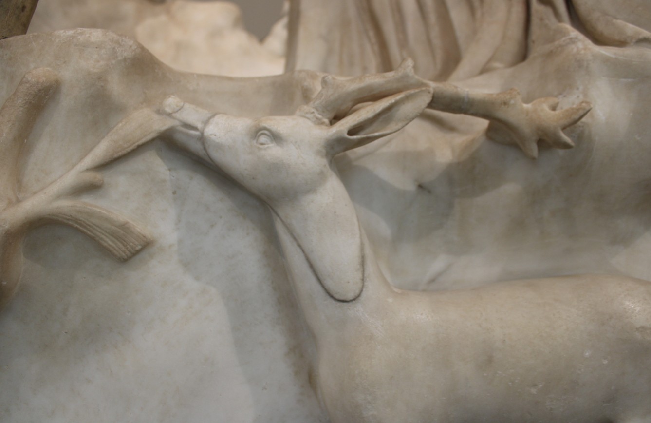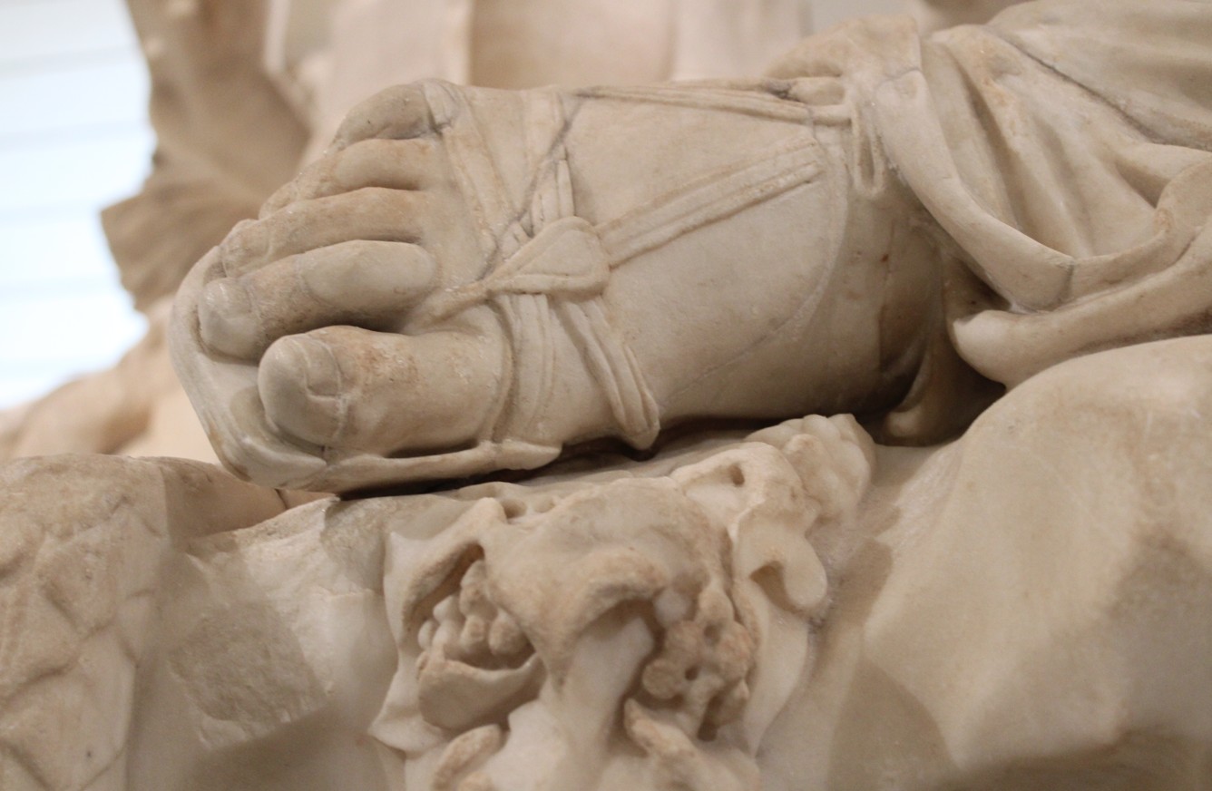 Added to the rich and complex composition is the female figure of Antiope, the mother of the twins dressed in a chiton tight at the waist and with the spear held in her left hand. He watches the scene without actively participating, almost as if he wanted to control every movement of the participants without providing his help or taking sides.
