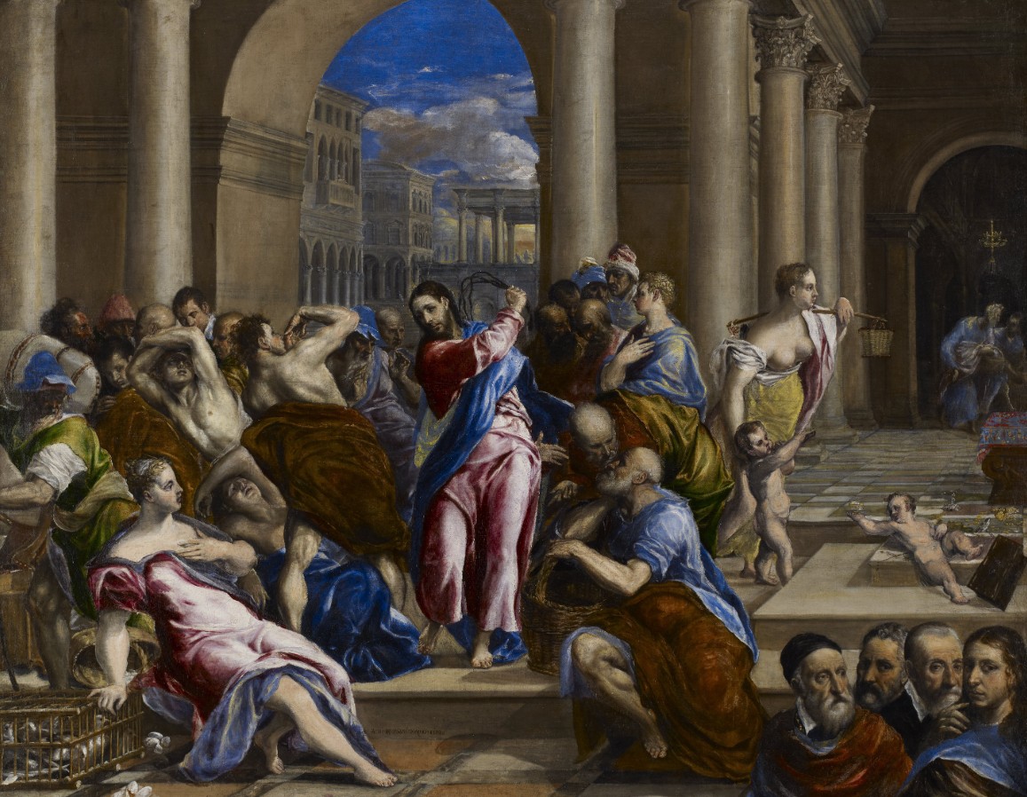 Mentre al centro della scena si vede Cristo che con un flagello in mano scaccia i venditori dal Tempio di Gerusalemme dopo aver gridato loro “Non fate della casa del Padre mio un mercato”, nell’angolo El Greco dipinse me, Tiziano, Raffaello e Giulio Clovio.