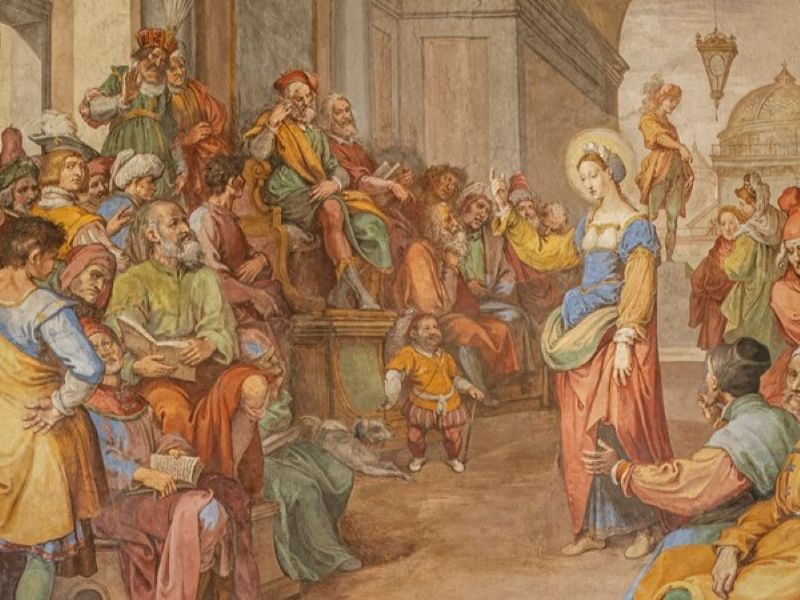 Finally, the entrance vestibule to the Stanze del Priore hosts the fresco by Bernardino Poccetti, “The Dispute of Saint Catherine of Alexandria with the Philosophers”, dated 1612.