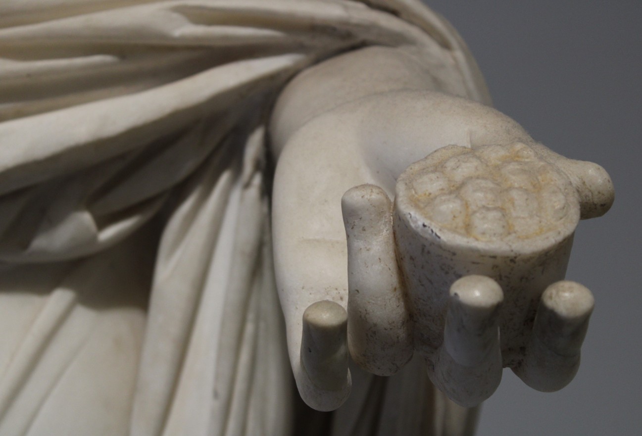 Sulla testa sfoggia una corona d’alloro mentre nella mano destra sostiene il contenitore per l’incenso: tutti elementi che mostrano il suo status di sacerdotessa.