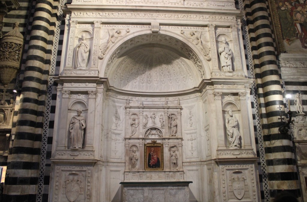 Those modest-sized works would enrich the Piccolomini Altar for Cardinal Francesco Todeschini Piccolomini in the Cathedral of Santa Maria Assunta in Siena.