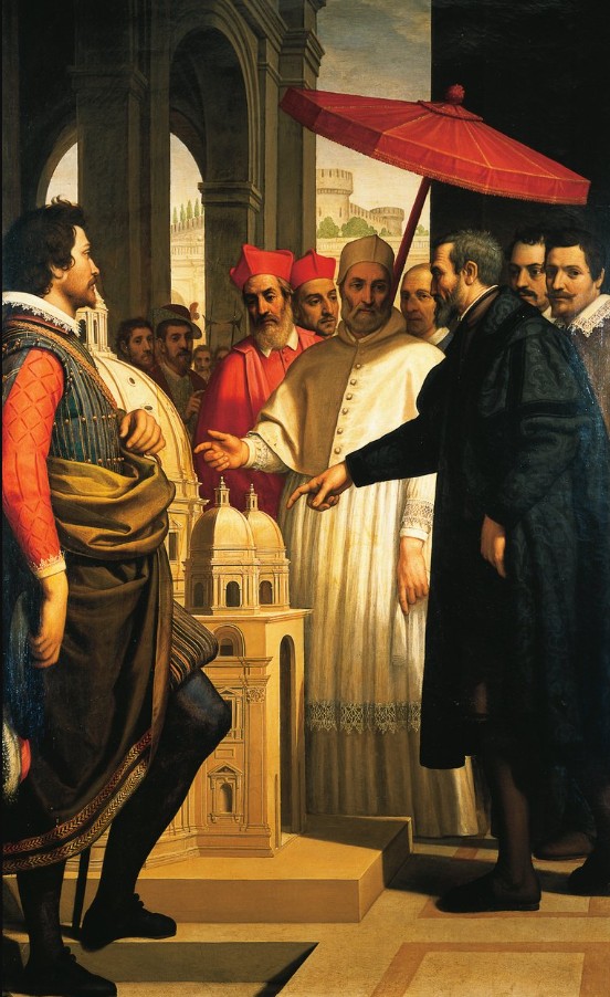 Dovete sapere che in questo dipinto c’è un errore grossolano. L’iscrizione latina posta alla base del dipinto indica in maniera sbagliata il nome di Paolo IV ma in realtà il pontefice in questione è senza dubbio Pio IV. Paolo IV fu invece colui che mi commissionò le fortificazioni che vedete in secondo piano. A quanto pare il Passignano, al secolo  Domenico Cresti, fece un po’ i confusione tra i due papi.
